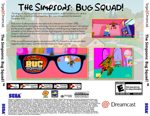 Custom box art for the unreleased NTSC version of Dreamcast's The Simpsons: Bug Squad in the pre-2000 white label style.