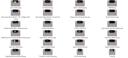 'the 8;40 35 Questions Deluxe Akogare 2 Akogare Mario Autumn 1.1 Classic Mario World 1 The Magical Crystals Classic Mario World 2 The Great Alliance Classic Mario World 3 The Finale El Dorado Exodius 1.1 Fire and Ice GAIDEN v1.13 HYPERION Invictus JUMP JUMPhalf Learn 2 Kaizo Luminescent Mario is Missing MOON New Super Mario World 1 The 12 Magic Orbs 1.4 New Super Mario World 2 Around The World Panga's Kaizo Kindergarten Quickie World 2 Quickie World With a Vengeance Quickie World R-ACK_10.0.0 Scary Bosses and Nice Sprites SMW Quest For Gaming (English Version) Super Mario Infinity 2 Super Mario Infinity Super Ryu World 2 Super Ryu World SuperCindyWorld SuperCindyWorld2 SuperCindyWorld3 SuperMarioUniverseDELUXE The New Comfort Zone The Unknown This Hack Needs a Name TIAGHTPIYJSPKW_V1.1.1 ukraine detroit VLDC7 VLDC8 VLDC9 weekend-at-luigis-v111 YUMP YUMP2